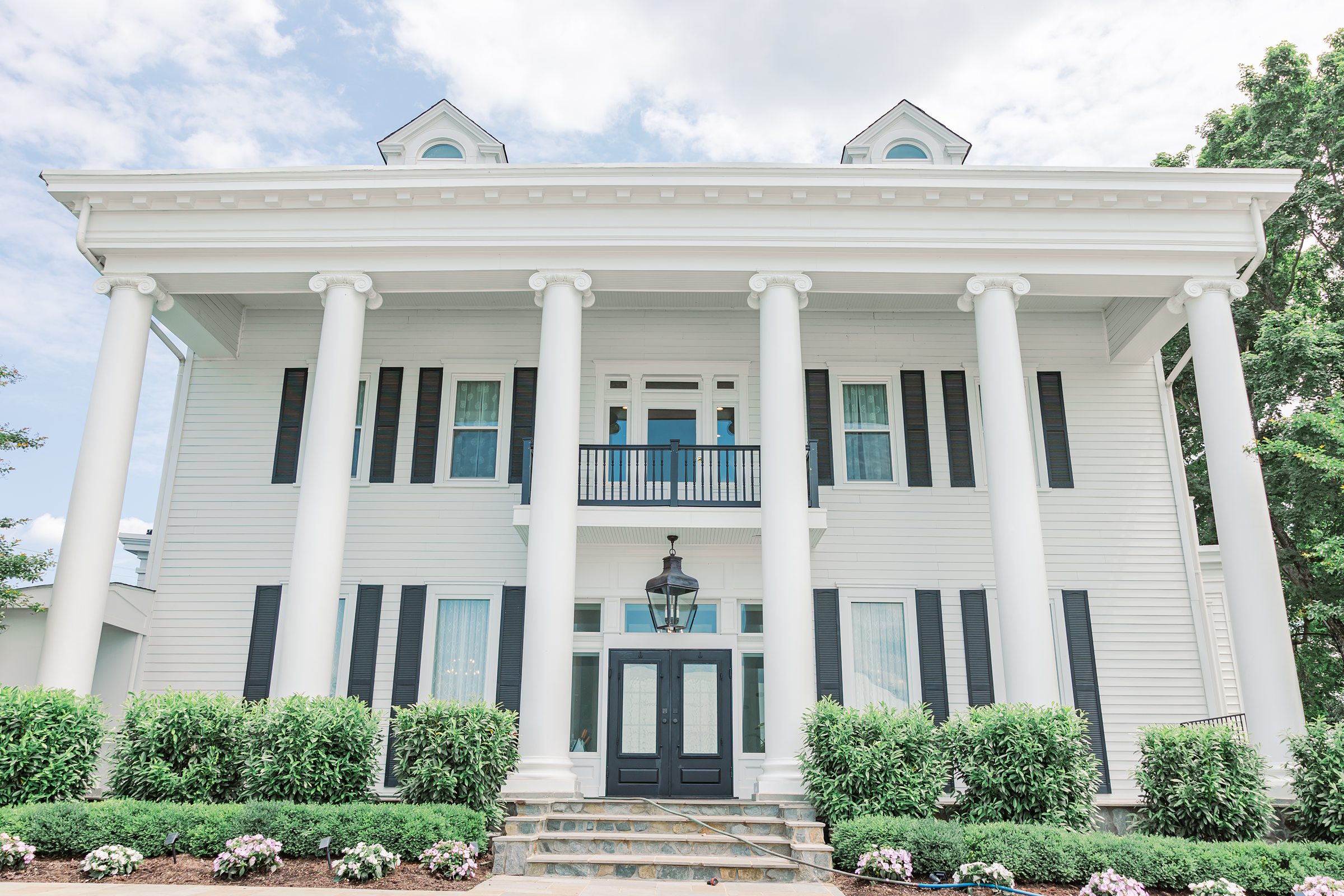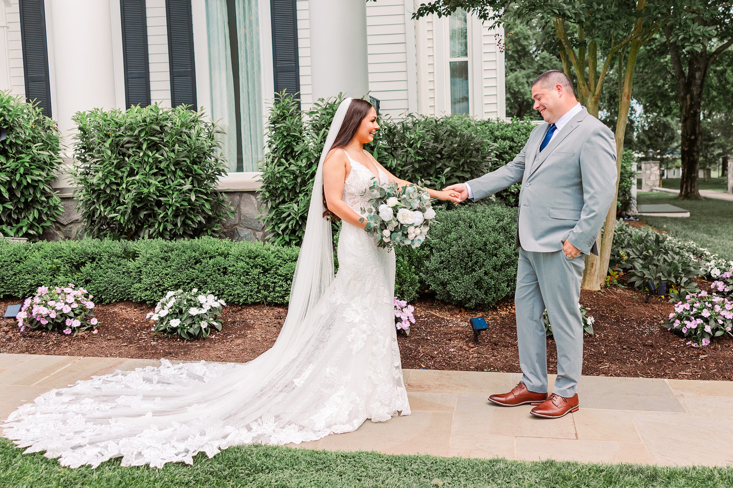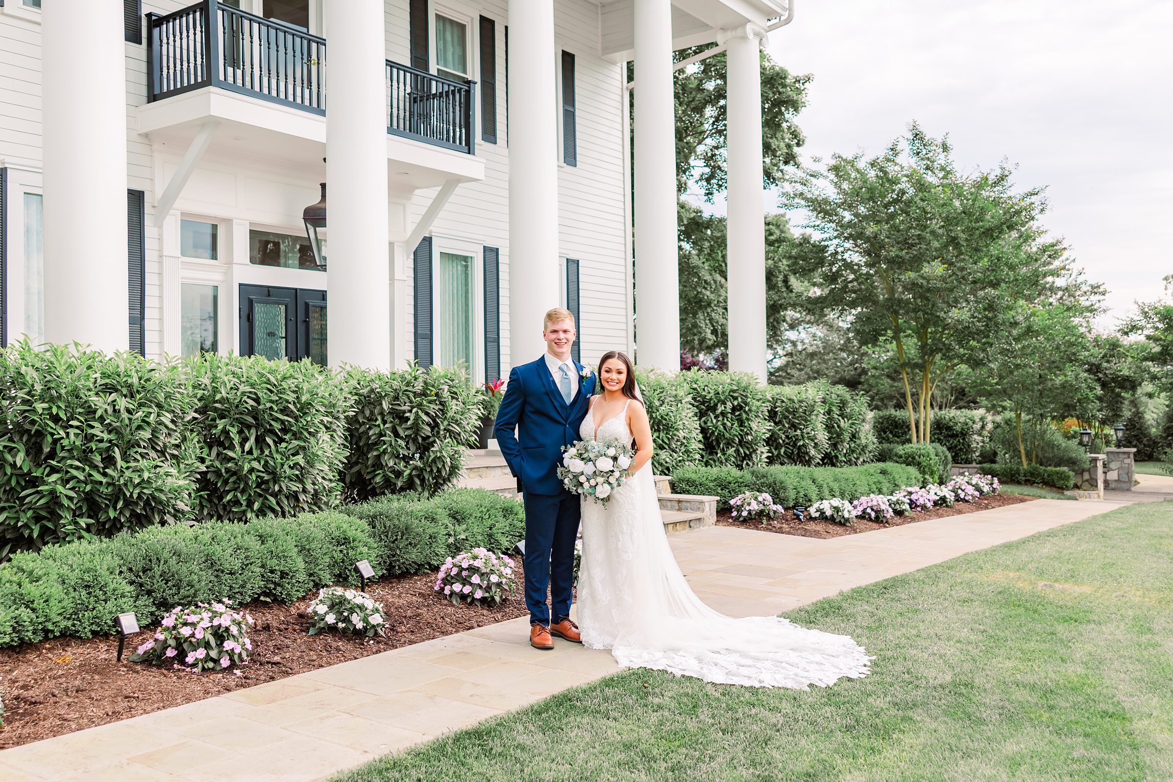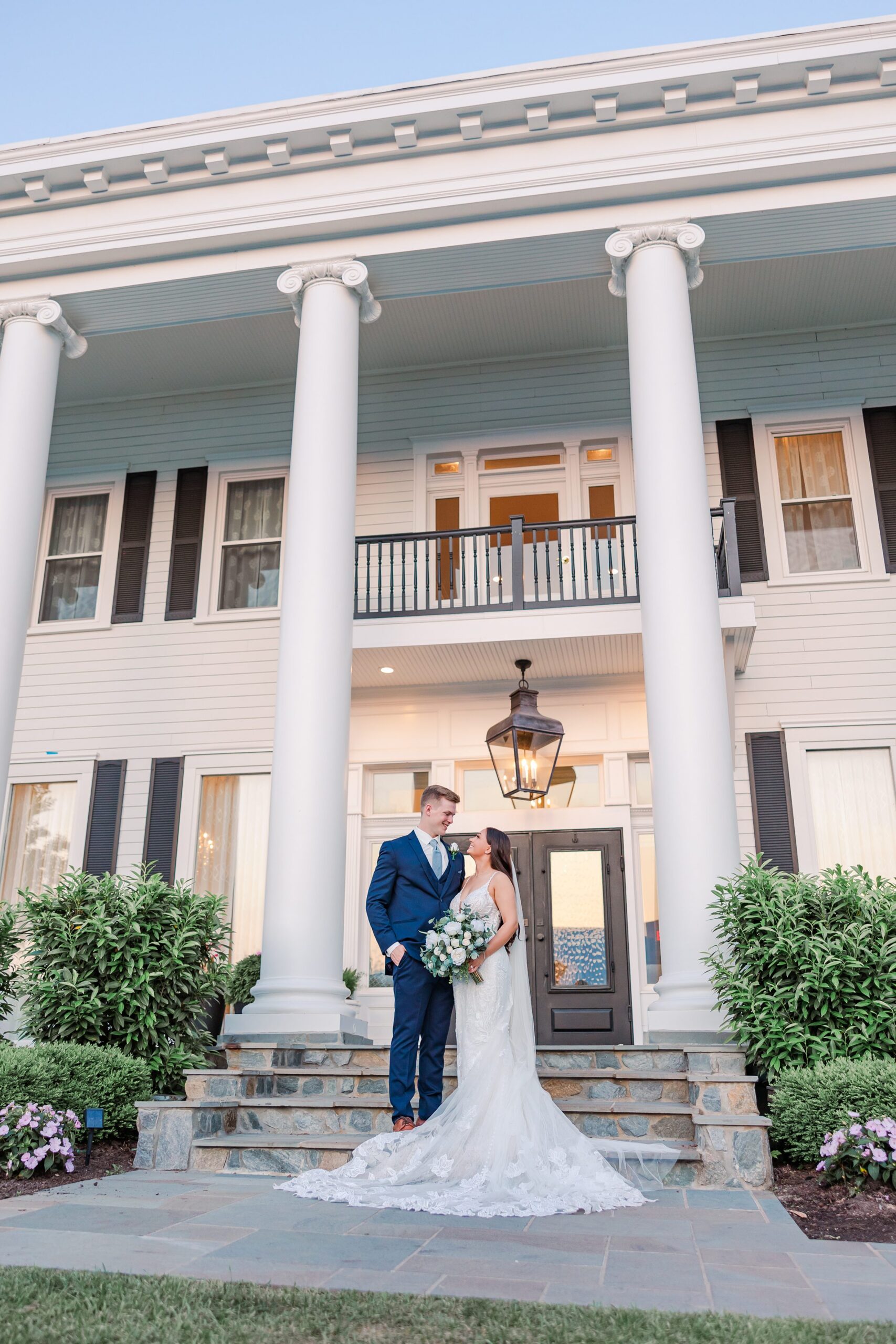 The tall white columns, dramatic staircase, and expansive golf course created the perfect backdrop for portraits that felt both classic and romantic.